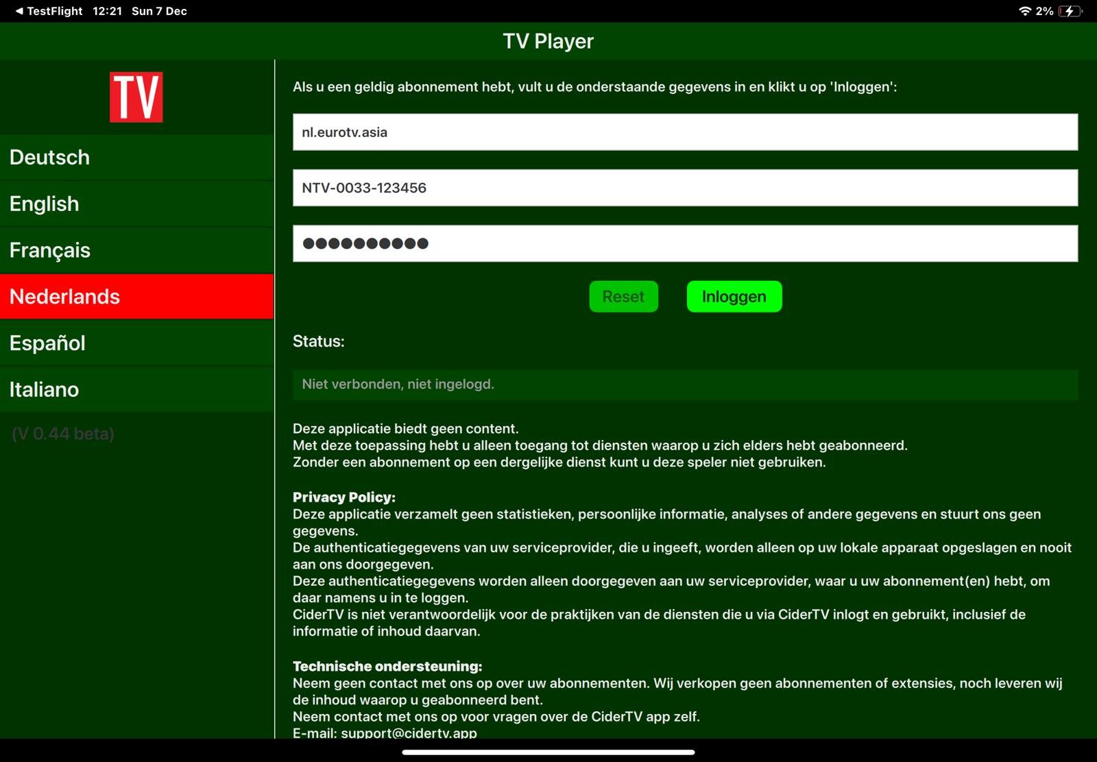 - Kies in CiderTV “Dutch”. Schrijf in de eerste regel: nl.eurotv.asia , in de tweede regel uw contractnummer, bijvoorbeeld: NTV-0033-123456 en in de derde regel uw wachtwoord, bijvoorbeeld: riloehbe
